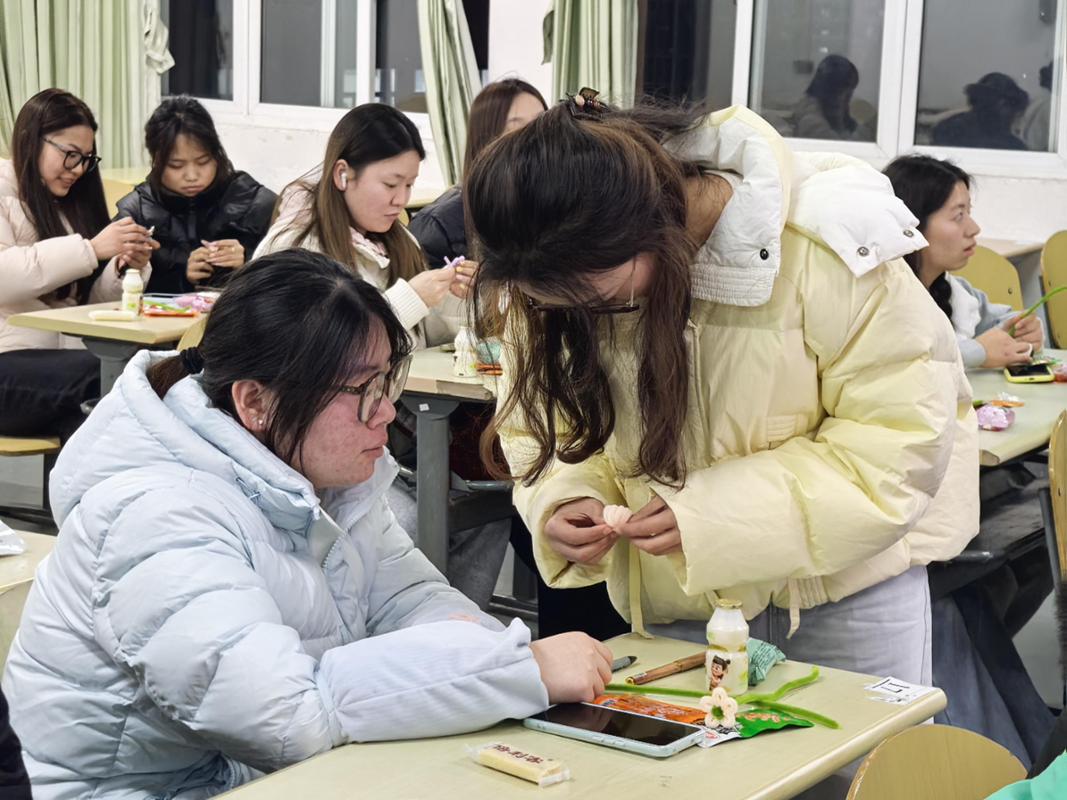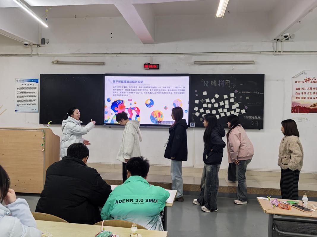 情绪拼图,绘出心声。同学们手持便利贴,以简笔画勾勒当下心情,或开心、或平静、或略带迷茫,共同粘贴在黑板上。碎片汇聚成完整图案,每一片都是真实情绪的流露,每一块都是青春心灵的拼图。大家在创作与拼接中,卸下心理防备,勇敢表达内心感受,让情绪被看见、被接纳;不听指挥,欢乐解压。主持人发出指令、指向方向,喊出“321看这边”,参与者需快速转向其他方向。现场笑声不断,反应比拼紧张又有趣。大家在轻松游戏中放下压力、舒展身心,更收获快乐与自信;数字炸弹,自信闪光。6名同学依次猜测1—100区间数字,主持人实时提示大小。猜中“炸弹”数字的同学,现场大声说出自己的三个优点。从腼腆到从容,从犹豫到坚定,同学们在自我夸赞中发现闪光点,强化自我认同,学会欣赏不完美的自己;扭出春天,手作暖心。主持人提前播放扭扭棒小花制作示范视频,清晰讲解弯折、缠绕、定型等关键步骤,为同学们搭建直观的创作参考。针对部分动手能力稍弱、操作生疏的同学,活动部成员主动上前提供帮助,指导扭花技巧,耐心纠正细节。在大家的共同协作下,扭扭棒在指尖弯折缠绕,一朵朵色彩缤纷的小花悄然绽放。同学们将亲手制作的小花带回,把温暖与希望装进口袋,寓意把春天与美好常伴身旁。